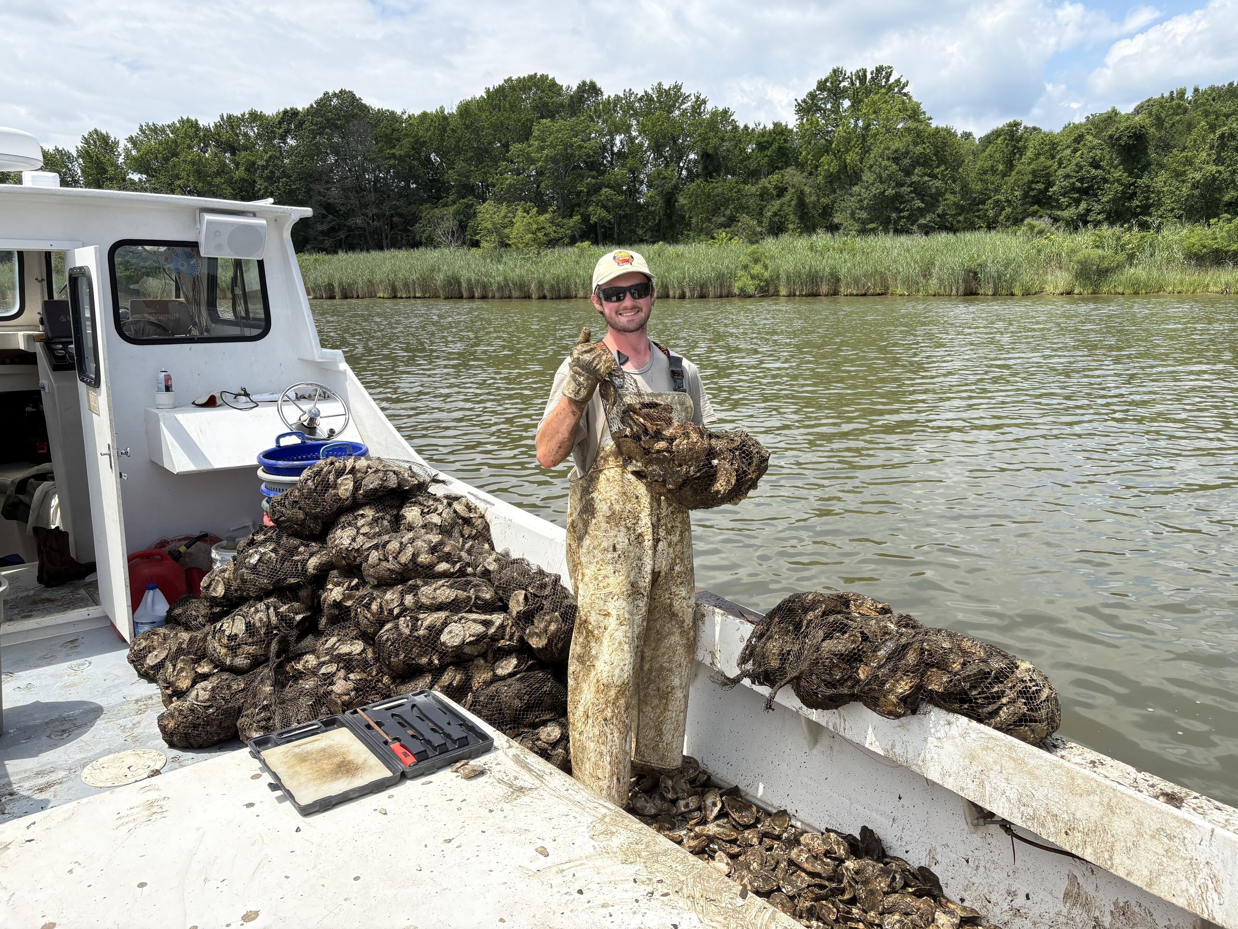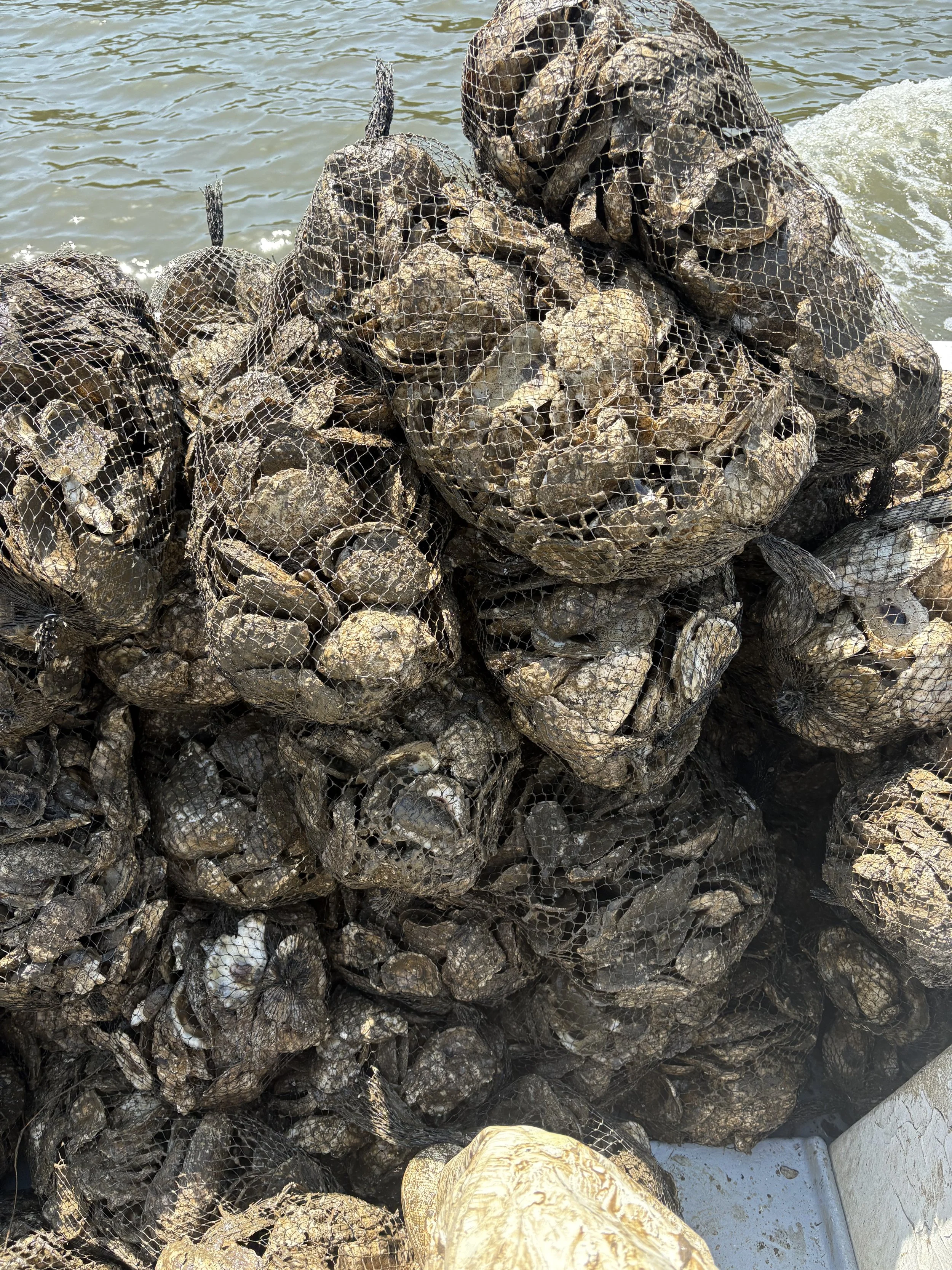 Picture below is our re-seeding process. Two million spat (baby oysters) are set upon 300 bushels of recycled oyster shells, then moments later loaded on our vessel to be planted on our Private oyster bar in the Rhode River.